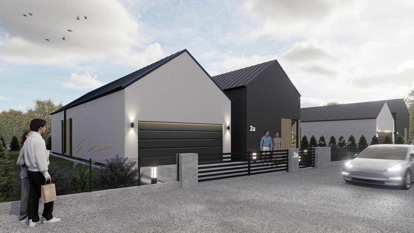 Aby zapewnić większą elastyczność w aranżacji wnętrz, w projekcie przewidziano ogrzewanie podłogowe. Do każdego budynku przynależy również garaż na dwa samochody, kotłownia z pralnią, wiatrołap oraz taras z ogrodem. Warto także zwrócić uwagę na elegancką elewację – połączenie bieli i grafitu tworzy stylowy duet, który dopełnia subtelny akcent imitacji deski elewacyjnej.