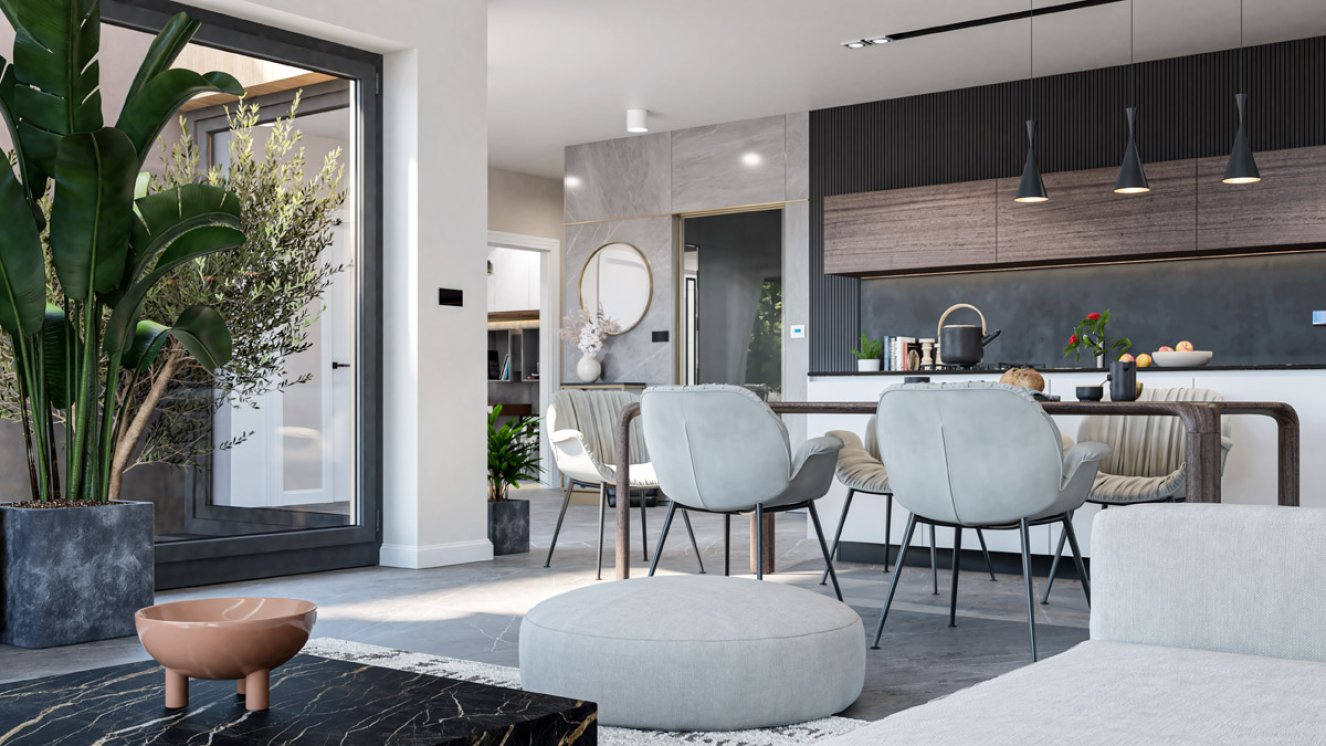 Dom zaprojektowany w stylu nowoczesnej stodoły przyciąga uwagę nie tylko estetyką, ale również wyjątkową funkcjonalnością. Każdy budynek składa się z trzech części. Dwie z nich, znajdują się na parterze i połączone są korytarzem, który płynnie oddziela dwie główne strefy domu. Część dzienna, zaprojektowana z myślą o wspólnym czasie z rodziną, charakteryzuje się przestronnym układem, gdzie strefy wypoczynkowa, kulinarna i jadalniana łączą się w sposób naturalny, nie zakłócając ich funkcji. Kuchnia z wyspą otwiera przestrzeń dzienną, prowadząc do jadalni i salonu. Tu kluczową rolę odgrywa przestronność – wysokie na 5 metrów sufity i duże, katedralne okna wpuszczają mnóstwo światła, a jednocześnie subtelnie łączą wnętrze z ogrodem.
